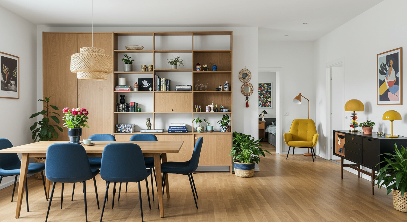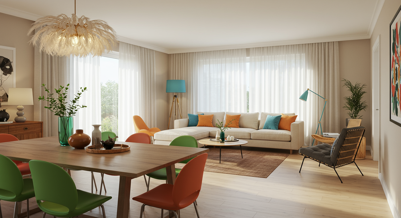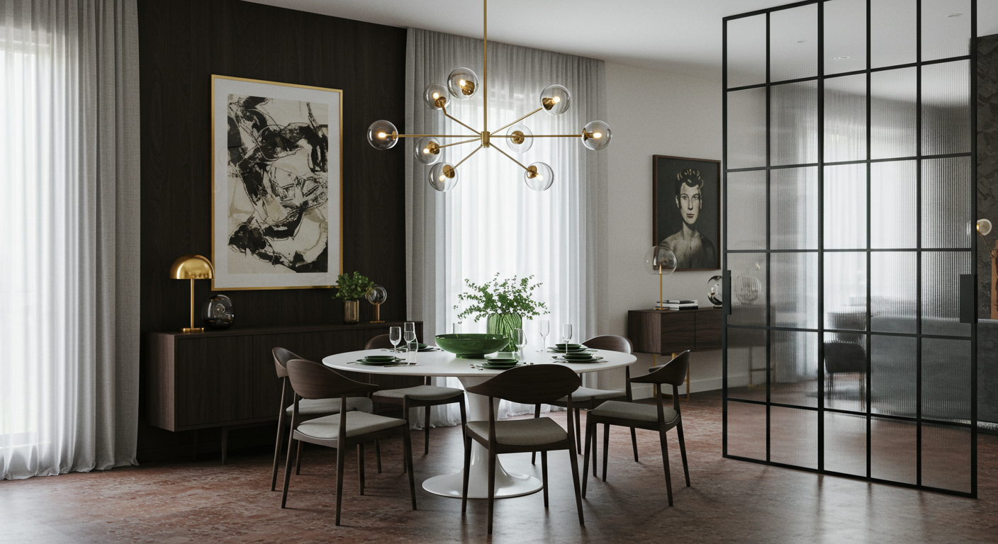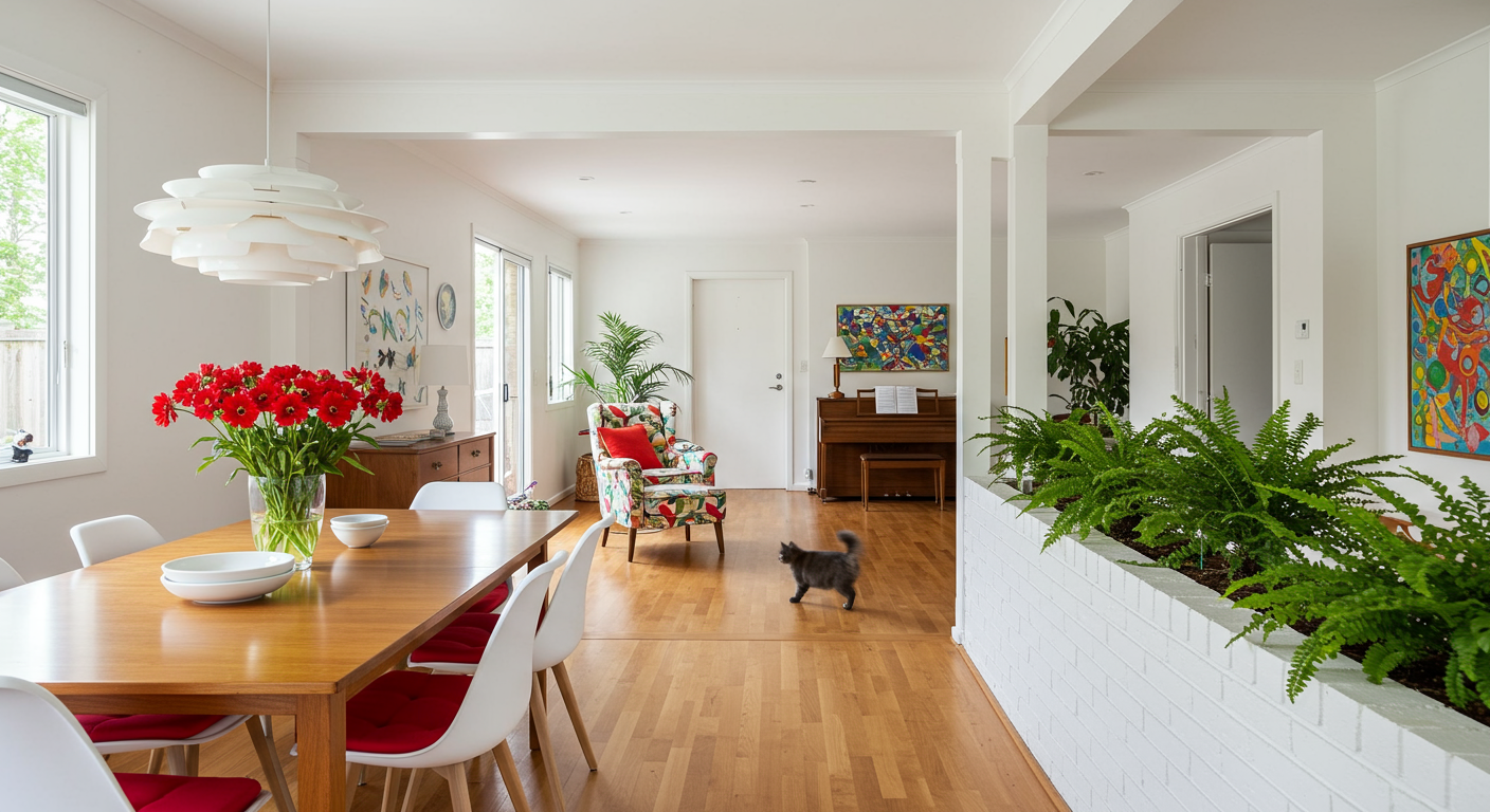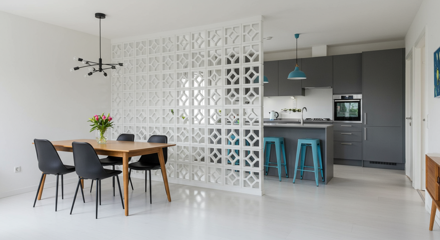 Here, classic midcentury modern-style breeze blocks coordinate with the Eames-style dowel leg chairs and other midcentury-inspired details.