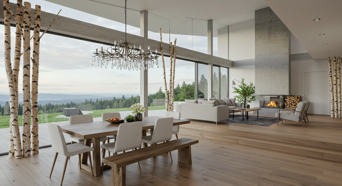 In this Montana home, an installation of what appears to be birch trees and trunks cordons off the dining area from the living room. Also, notice how the level change defines the spaces, as does the large light fixture over the dining table.