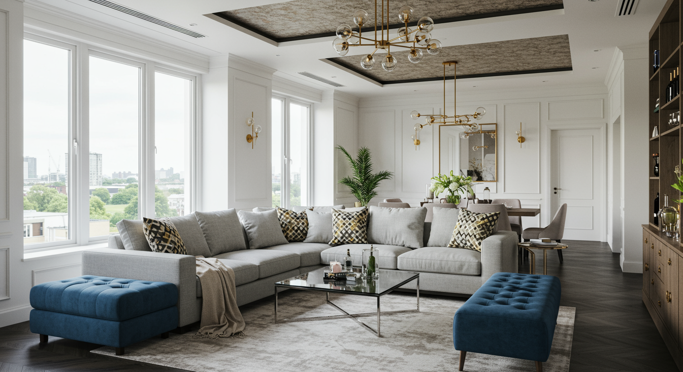 Sometimes the best ideas come from above. The inset ceiling in this living room is dressed in wallpaper and finished with multiple bulb lights. This feature stylishly characterizes the sitting area.