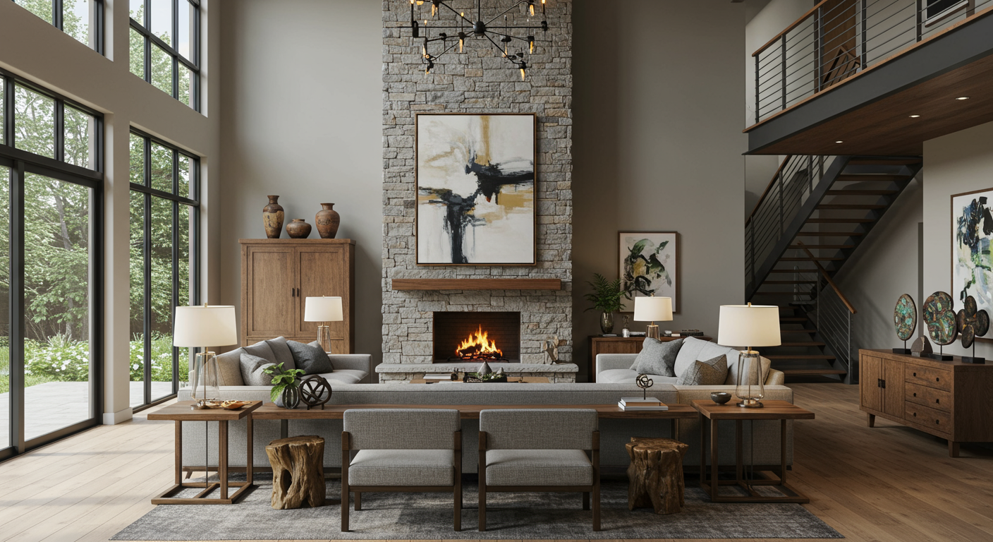 For example, if your living room is alongside your dining room, make sure your sofa has its back to the table or that your chairs are facing the fireplace, like in the space shown here. This will create a notion of separateness. Having textured portions of wall, like the dramatic stone fireplace here, also helps visually signal different areas.