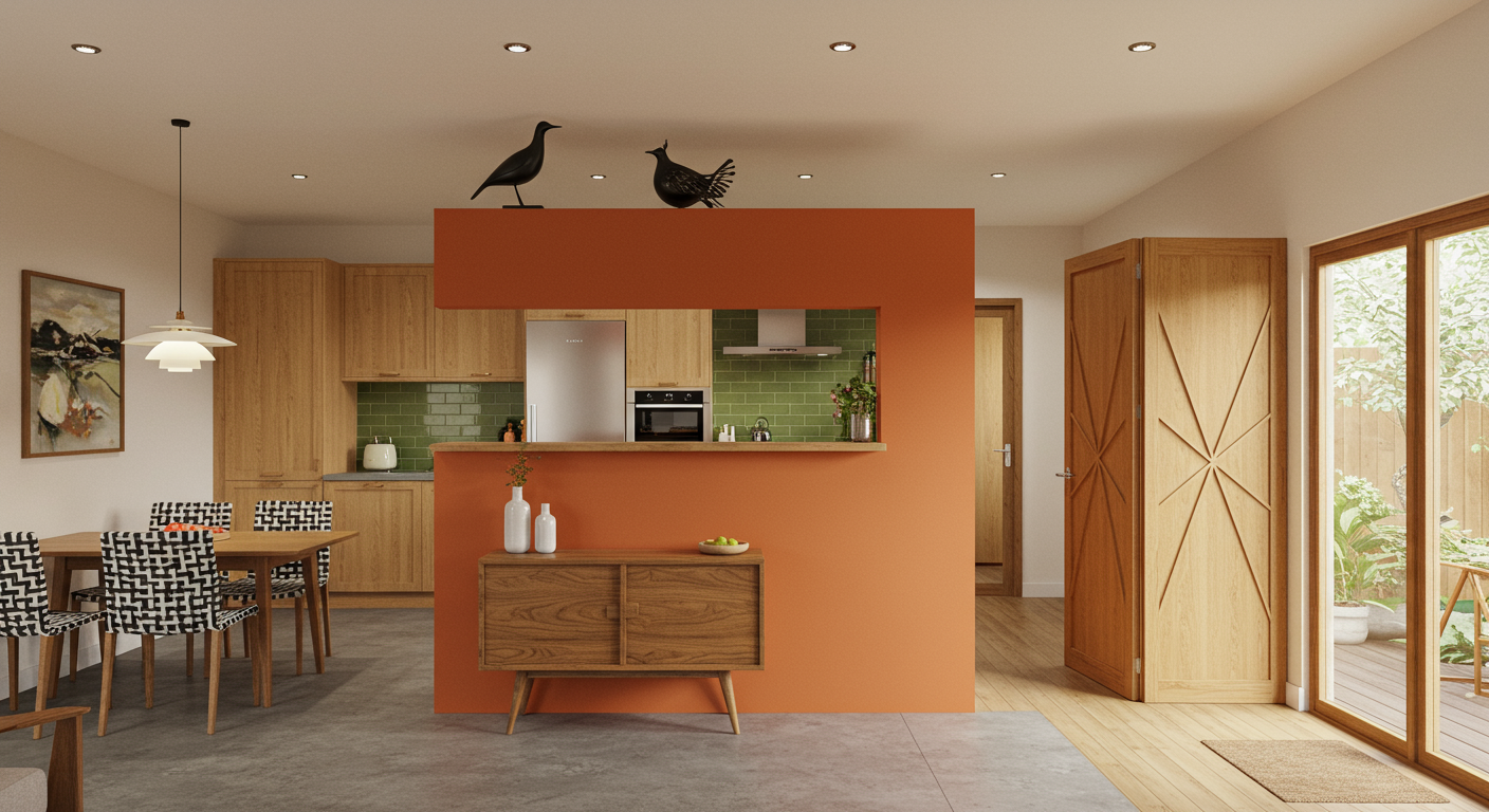 And you don’t have to add a full wall. Sometimes a pony wall or a partition wall like the orange one shown here that stops just short of the ceiling is enough. Plus, a simple non-load-bearing wall made with two-by-fours and drywall is relatively easy to put up and take down.