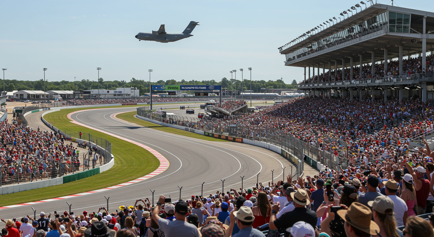 30 September, 2018: The North Carolina Air National Guard 145th Fighter Wing flies a C-17 over during the Charlotte Motor Speedway during the national anthem for the NASCAR Bank of America Roval 400 in Concord, NC. (Photo:HHP/David Tulis)
