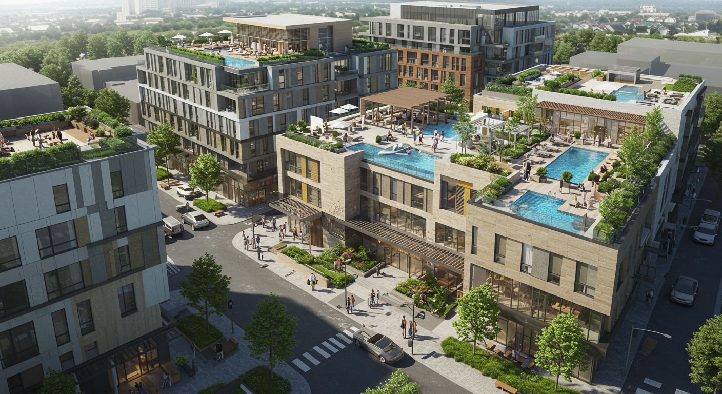 - A pedestrian-friendly “main street” throughout filled with green space and room for artwork.