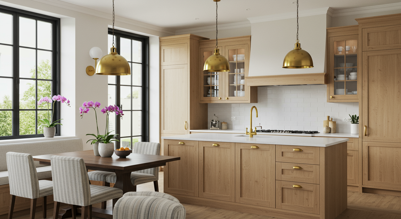An L-shaped banquette breakfast nook takes center stage in this Chicago kitchen by Mason & Brass. It serves as an updated version of a traditional kitchen table, providing a wonderful eat-in space. Light wood cabinets, brass finishes and backsplash tile with a handmade look give the space sophisticated style without being fussy.