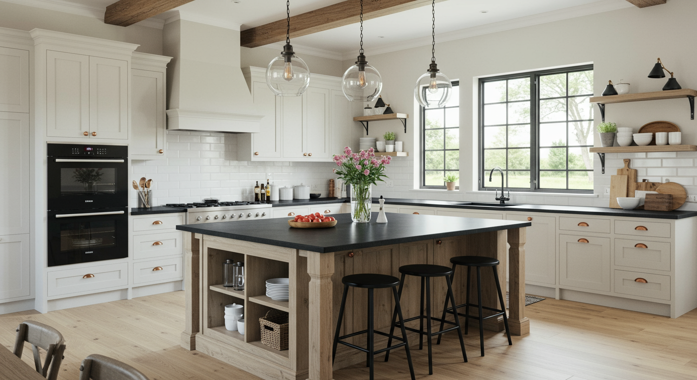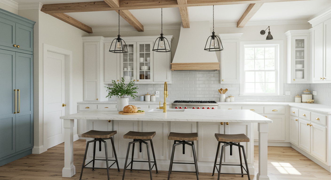 The most popular kitchen of 2021 also mixes colors and materials, creating a style that looks pieced together over time. Austin, Texas, designer Ariel Bleich balanced raw wood ceiling beams and other wood details with glass-front cabinets, textured taupe-colored backsplash tile and a dollop of blue cabinetry to keep the eye moving. A warm and creamy shade of white (Marshmallow by Sherwin-Williams) on the rest of the cabinets, walls and trim keeps the space from veering too sterile.