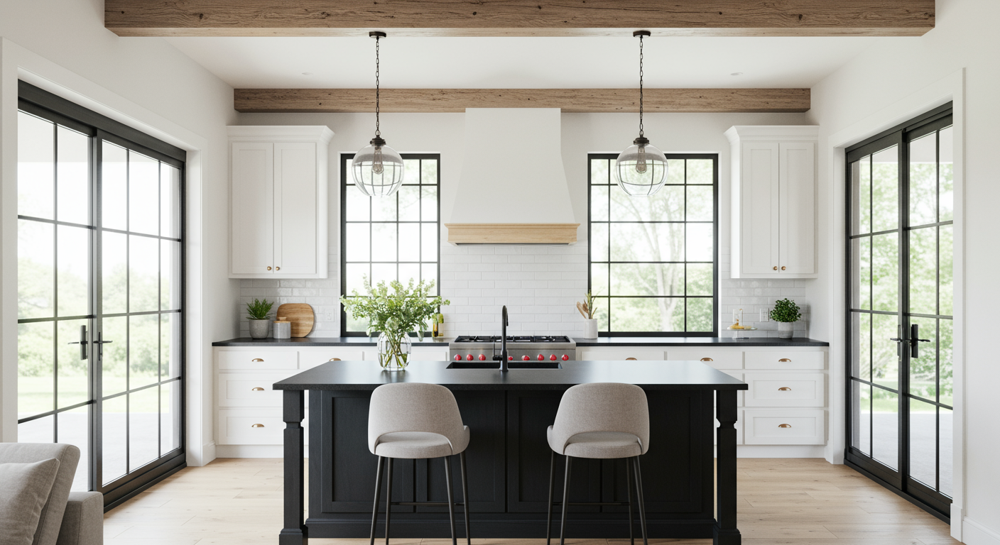 In this Minnesota lake home kitchen, designer Laura Tays of Tays & Co Design Studios created a pleasing mix of colors and materials. The island features a rough-sawn white oak base with a soapstone countertop. The creamy white cabinets are Shoji White by Sherwin-Williams. The perimeter countertop is marble. A plaster range hood with a bronze accent band hangs over zellige backsplash tile. Glass-front cabinets on the island end store extra dishes.
