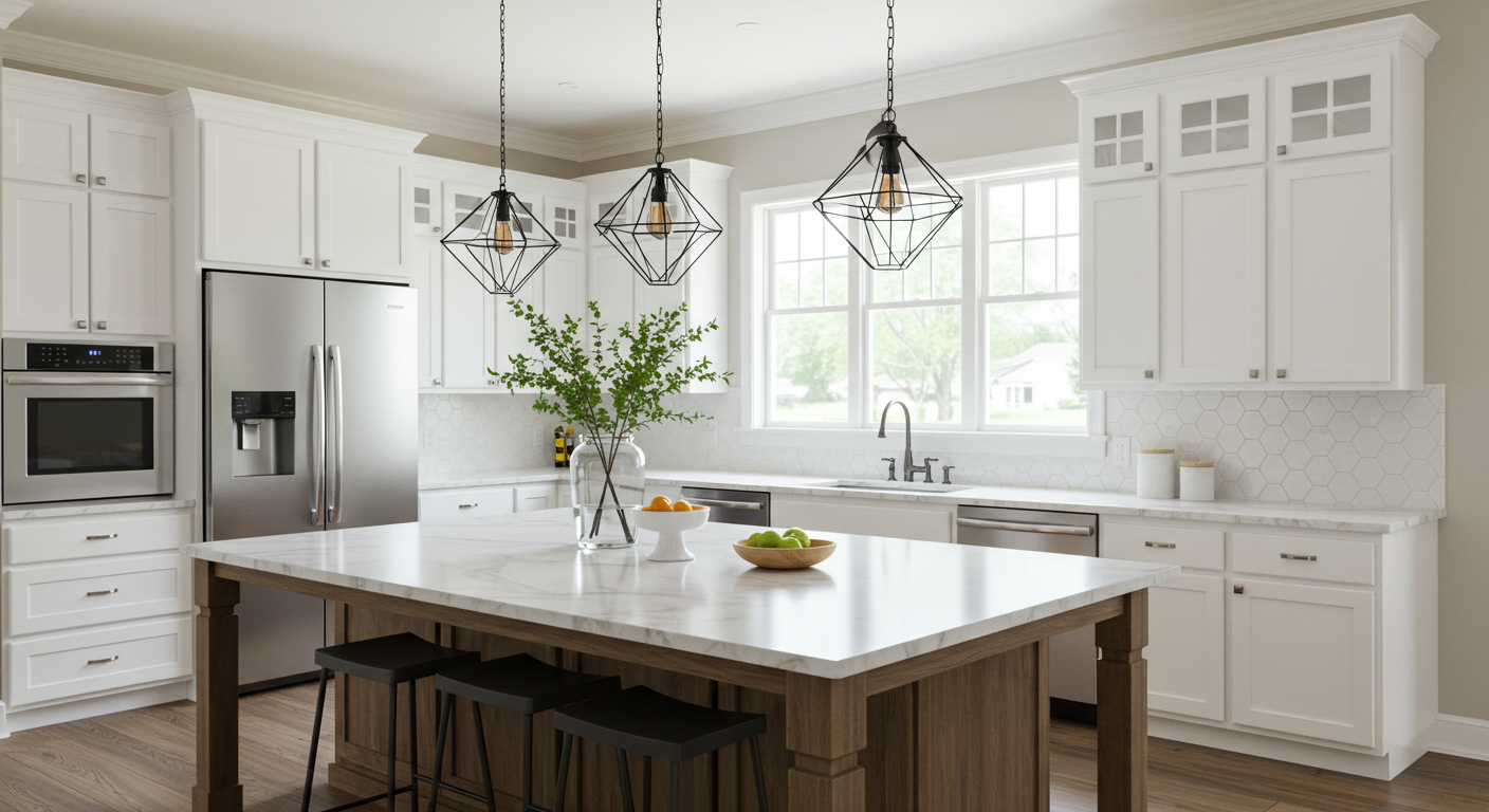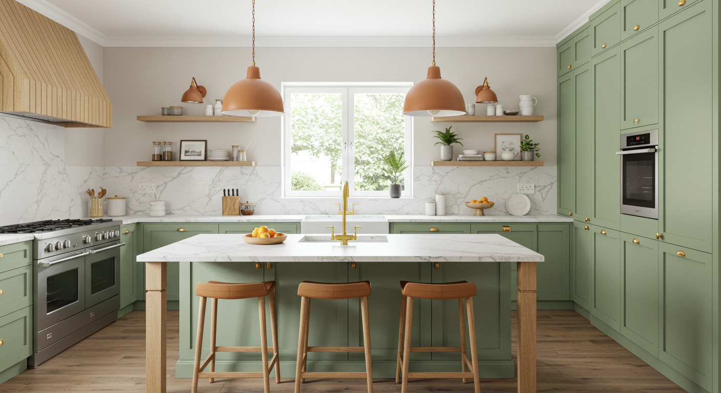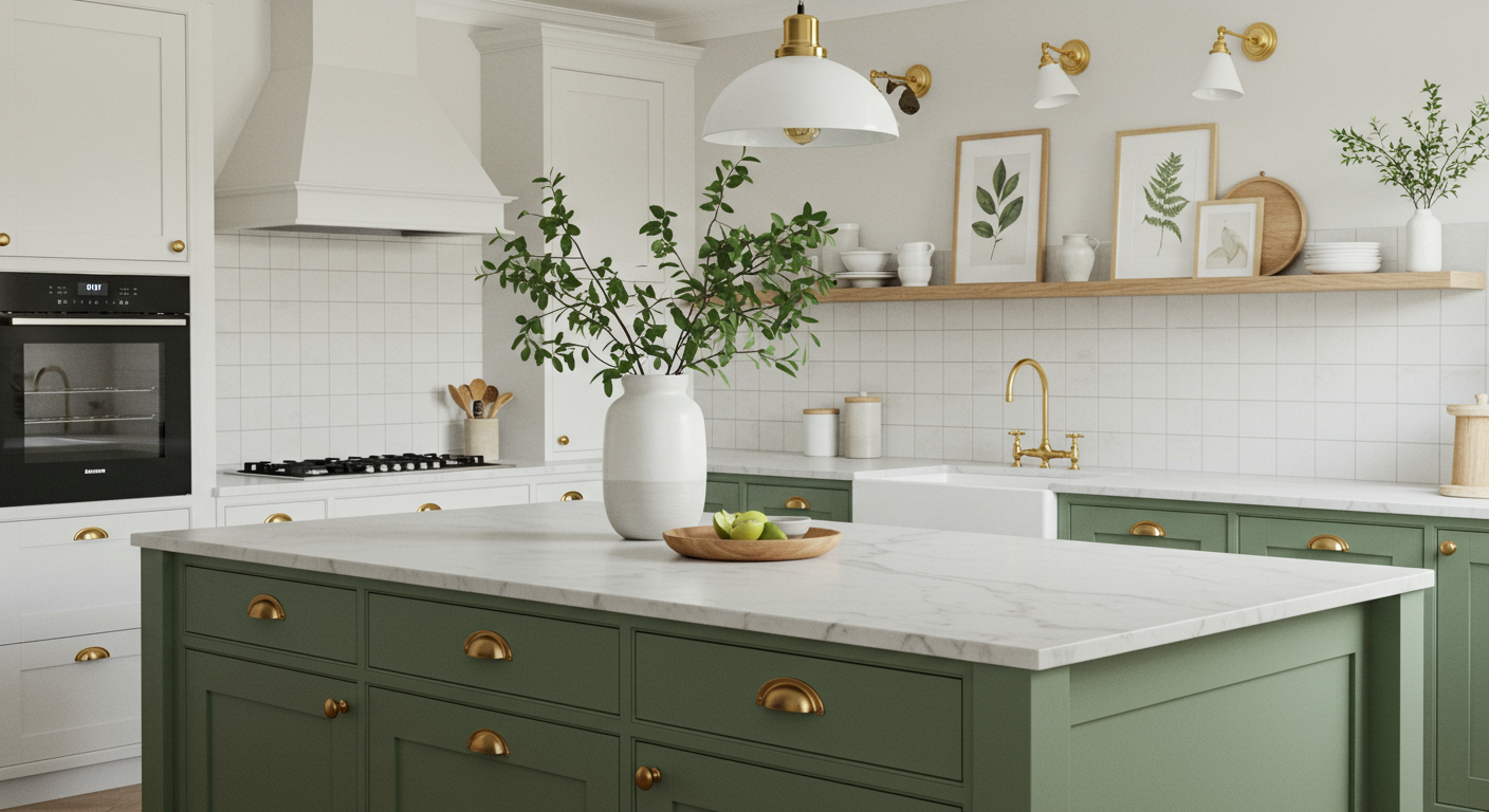 In this Southern California kitchen, Well Done Building & Design created a pleasingly calm palette with wood, marble-like quartz counters and a cabinet color that looks plucked from an herb garden (Retreat by Sherwin-Williams). Modern pendant lights, brass hardware and a special custom vent hood add the right amount of energy to the calm space. A 10-foot-long island offers face-to-face seating.