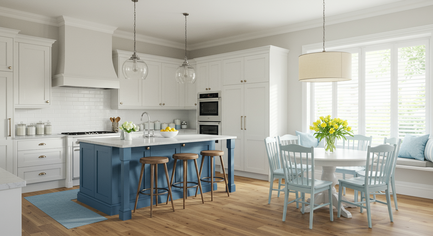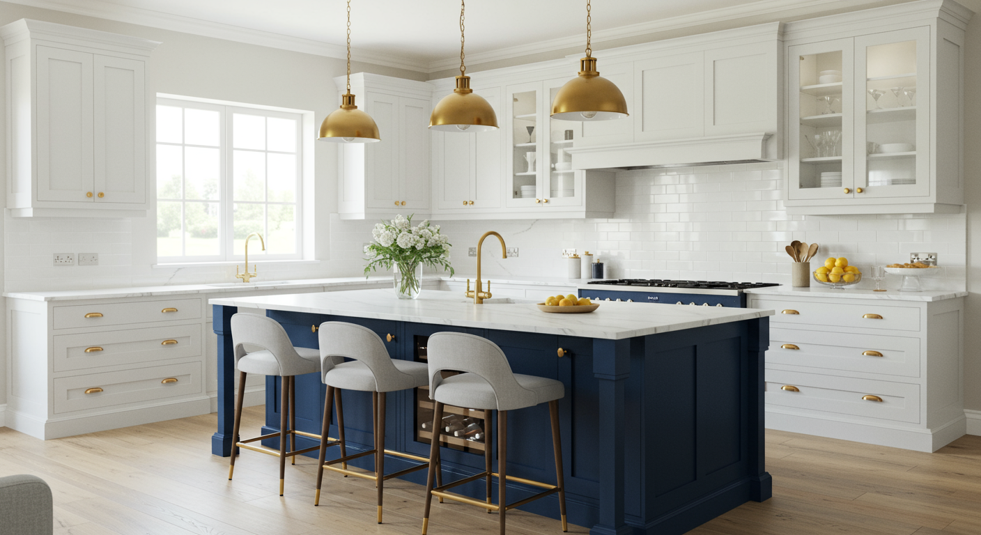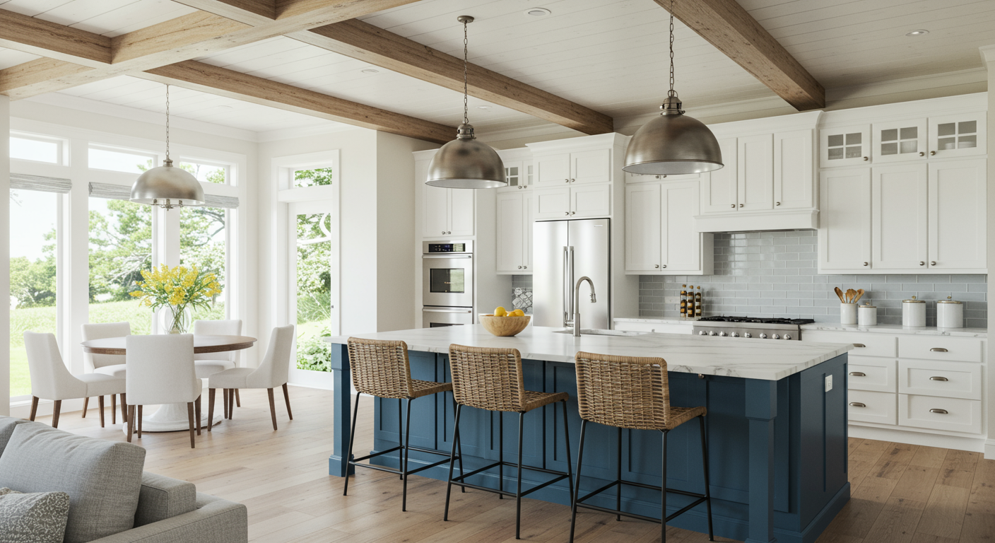 Kitchen islands present an opportunity to introduce a different color from the rest of the cabinetry. Designer Jena Bula of Delphinium Design helped her Charlotte, North Carolina, clients land on Benjamin Moore’s Newburyport Blue for their island. The deep color provides contrast to the white cabinetry and complements the rich floor tone.